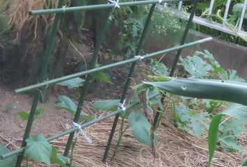 残暑お見舞い申し上げます今日も朝からカンカン照り昨日7月分電気料金ハガキきましたよやっぱり前年月より2000円位高い・・娘が「2千円位で命守れるなら・・・」と起きるなりエアコン稼働、一日中稼働(寝るまで・・)水掛けだけはやらねばならぬあらら・・伸びたね7月14日、秋取キュウリとズッキーニ種蒔きしもの8月1日に植えました。敷き藁してほっといてました。支柱立てやらねばと思えど・・猛暑を言い訳にサボってました汗タラリ動き遅しこんな暑い日に・・支柱立てしましたたった4本これだけの事、なんとか出来ました収獲の喜び味わえるかしら・・いつまで続くこの暑さ・・気力低下です