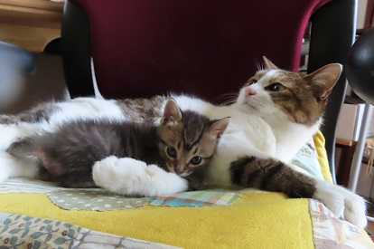 今日も危険な暑さ・・まだまだ続く予報よいつものように、5時起床地植えの宿根草にも水掛けてるが・・・水不足暑さ障害蒸れによる根腐れ枯れてる・・なるようになるさ・・諦めムードチビ猫メルちゃん初病院へ連れていきました。娘がワクチン接種しなければならないと・・猫バックへ「何処へ連れていくのニャー」,車中では私の膝の上で「にゃーニャー・・」落ち着かない母猫からの免疫が無くなる頃だそうワクチン接種で免疫をつけ、病原体が入ってきてもやっつける事できるとのことよ初注射チク ギァ写真撮る間も無く一瞬で終わり次は3ヵ月後よ・・性別判明ドクターさんあそこ見るなり「メスです」メス希望だったので・・娘も大喜び命名【メル】本決まりです先住猫、プリン私にベッタリ・・膝の上か・・私がパソコン始めると・・こんな事です・・20歳のおばあちゃん猫、食も細くなって・・瘦せてきました