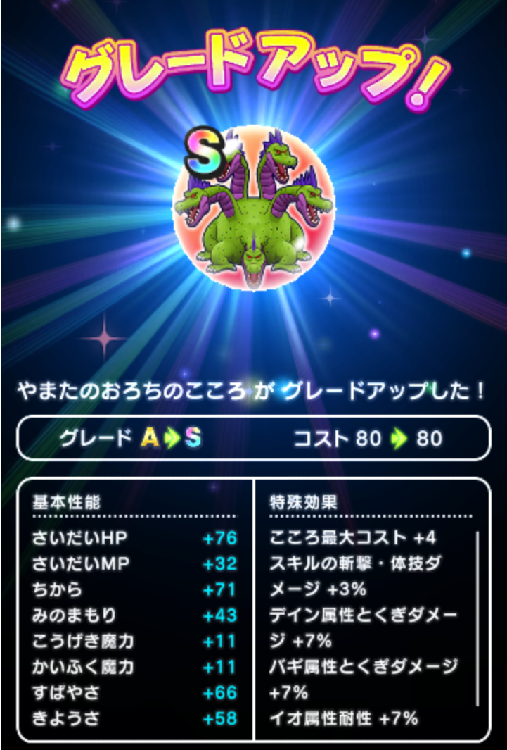 え~と、現在、ルイーダの依頼が、295回倒してきてなので…約300回で、Sの直ドロップが2回。で、上のスクショのように、合成して1個。合計3個になりました。ちなみに、カンダタの方は、400回近く倒して、Sのドロップはナシ。合成も1個なので、自分としては、カンダタの方が、ドロップ率が渋い感じです(苦笑)とりあえず、やまたのおろちは3つになったので、強敵を切り替えて、この後は、カンダタを倒しまくりますわ(笑)【エントリーでポイント10倍!(4月16日01:59まで!)】【中古】ドラゴンクエストモンスターバトルスキャナー/ギガレア/M/モンスターチケット/戦え!ドラゴンクエスト スキャンバトラーズ5弾 やまたのおろちステージ 05-056 [ギガレア] : やまたのおろちスキャバトでは、とうとうSサイズになってしまいましたね(苦笑)