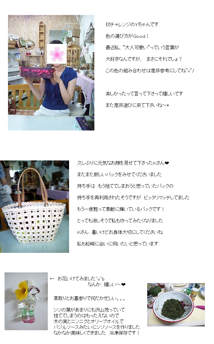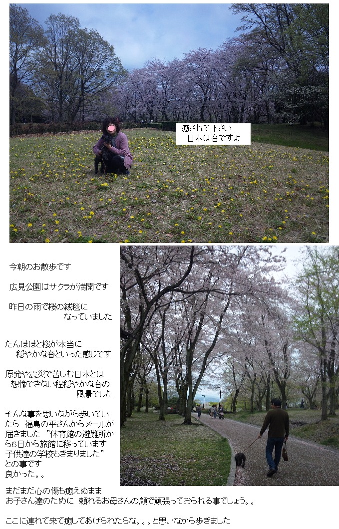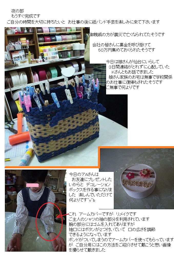 ずうっと心配していた福島県南相馬市の平●江さんの御無事が確認できました!!本当に安心しました会津の体育館に非難されていたそうです本当に良かったですお電話で紙バンド手芸の作り方の事でお話した事がある方ですお顔は拝見した事もありませんが楽座の展示会にも一度来てみたいとおっしゃって下さっていて主人も本当に心配していました御無事は確認できましたが御不自由な生活を続けておられることでしょうね。。今日は栃木のYさんともお話できて御無事を確認できました落ち着かない日々が続いていますがどうぞ皆さん お気をつけてお過ごしくださいね