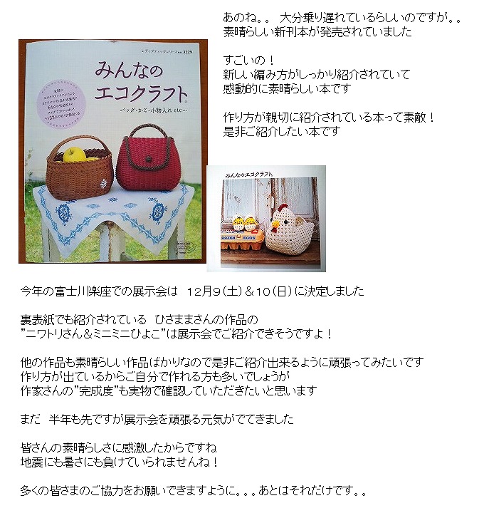 まったく 公私混同でやたらと忙しくしておりまして。。。世間から取り残されている感じ。。。焦りますがこういう時は仕方ない。。と開き直ってそれなりに一生懸命過ごしているのでありますが。。★みんなのエコクラフト(楽天ブックス)★