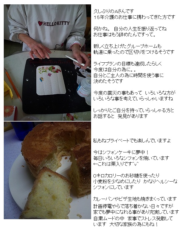 毎日シフォンケーキ焼いています自分で作ると カロリー0のお砂糖をつかったり小麦粉を少なくしたりできるので安心(笑)バナナや紅茶や生クリームやママレードや栗やチョコレートなど毎回いろいろいれてみて実験してます(笑) そしてこれは 地震の春休みの停電の合間をぬって三男坊が作ってくれた アボガドと菜の花のスパゲッティ~これが一番おいしかった ということで。。。また作ってもらおうという魂胆が丸見えだね(笑)