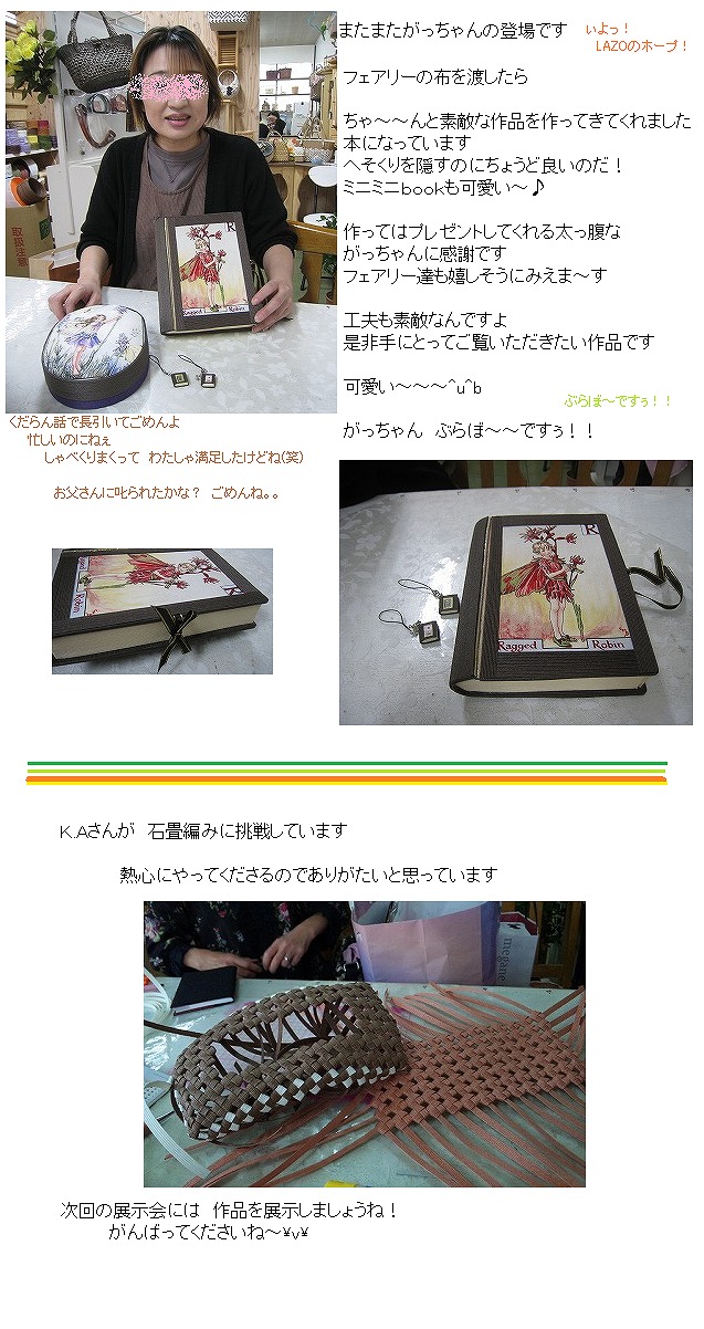 それからお知らせですが富士市中央図書館の分室で 吉野先生と生徒さんの作品展が開催されています 本日行ってきました先生が今度の楽座には来て下さると言って下さってすごく嬉しかったですお近くにお住まいの方はどうぞお出かけになってくださいね明日7日(日曜日)16時までです