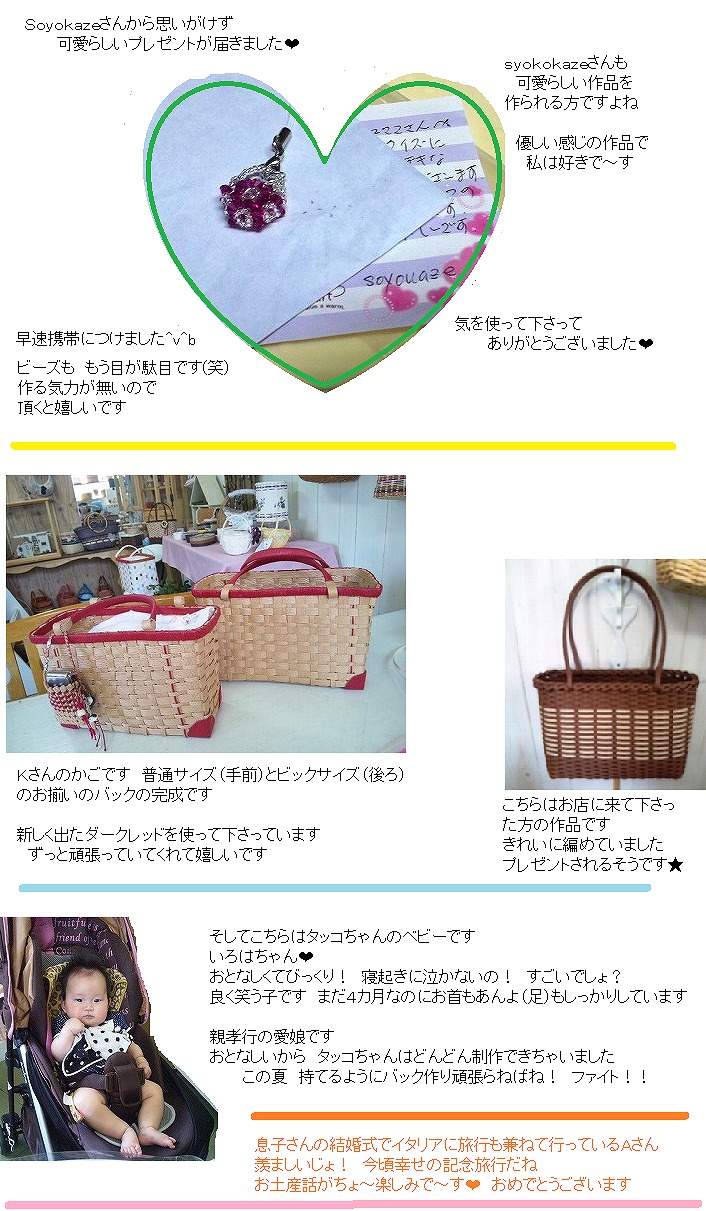 いつも紙バンド手芸をご一緒に楽しんでくださっているKさんからメールが届きました甥っ子さんが寄付をよびかけています静岡県富士市近辺にお住まいの皆さま どうぞご協力をお願い致します以下がKさんからのメールです--------------こんにちは甥っ子の雅裕からメールがきました 先日も雅裕達仲間が集まり被災地のスノーボード仲間に支援物資を届けに行きました そんな雅裕が立ち上げた支援活動です よければ協力してください(以下雅裕のメールの添付) : 今回の震災において沢山の方達が困っていますがその中でも今回は赤ちゃん洋品が大変不足しています。色々な物が必要ですがしぼらないと運ぶのもたいへんですご協力をお願いしていますので是非ご協力とメールの呼び掛けをお願いします 〓〓〓〓〓今週末の20日の日曜日に、荒川重機の倉庫で 東北地方太平洋沖地震で、被災した皆様に、救援物資を集めます!15日に起きた、富士・富士宮の地震がありましたが、今の富士・富士宮の状況よりも深刻な地域になります!毎日多くの子供達が餓死している現状を、見捨てるわけにはいきません!自分達の蓄えがある方は、少しでも構いません!分けて下さい!蓄えが無い方は、気持ちだけでも構いません!東北の被災地の子供達を救いましょう!お願いします!集めたい物は、・紙オムツ・粉ミルク・レトルトの離乳食・お尻フキ・生理用品になります!1人1人が、少ない量でも、富士・富士宮市民がみんな集まれば、大量な緊急物資に変わります!多くの方の気持ちと、日本国民の素晴らしさと、全ての愛を心よりお願い申しあげます!3月20日日曜日13時~16時の間です場所3月20日 13:00~17:00まで救援物資の回収当日雨の降る確率がかなり高い為、荒川重機の倉庫で直接行うことになりました荒川重機の倉庫は富士のラウンドワンの東ににあるサークルKの交差点を北に曲がり、北へ100m位行ったところの左にあります!住所 静岡県富士市今泉362-3是非多くの方にこのメールを送って下さい!このメールの責任者小口雅裕★小口雅裕さんのブログ★無力の私ですが 彼に思いをたくしたいと思ってます