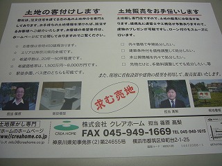 昨日は、午前中、定期ミーティングでしたそのミーティングで、いつも話題となるのが、お客さんに紹介する物件の情報の取得内々物件や、建築条件付物件の条件をはずせる物件情報、そして、訳合って早く売りたいため、金額をぐっと下げていい物件情報など・・・・今現在でも、たくさんのお客様が物件情報を待っていますそのために、物件情報をたくさん集めたいわけですそこでじゃ~んこんな広告を作りましたこれは、業者むけの広告です業者向けなので、ちょっと文章が荒いのは勘弁してくださいこの広告を神奈川県のほぼ全域の業者に配布しました写ってる写真は、私と、LANDMAN高梨ですそして、大きな目標は「あそこに物件情報をもっていけば、たくさんお客さんがいて、土地だったら制約に結び付けてくれる」そんな風に、他業者が思ってくれるような会社になることです物件情報がたくさんあるところには、お客さんもたくさん集まってきてくれるはずですそしてなにより、いつまでも信頼される会社でありたいと思っています