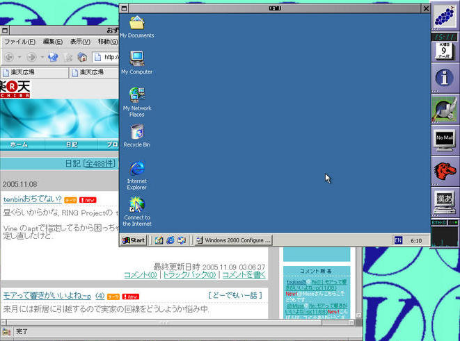 qemuっていうエミュレータをインストールしてみた. Vine 2.6だったけどconfigure/makeで一発だった. SDL-devel あたりが必要かもしれないけどね. とりあえず こんな感じでVineの中のアプリケーションとしてWin2Kが動いてる. あとで 時間があったら kqemuってacceleratorを試してみるかな. でも kernel moduleかぁ… ちょっといやだな. Kernelのバージョンアップとかしたときにめんどくさそうだ:-p別に普段生活していく上でWinなんて基本的にいらないんだけど, Google Maps APIなのを作っているときに 『IEで見られない』という現象があったので ちょっとチェックしたかったのだ. でも調べてみたら Java Scriptの GMapとかのあたりを funcitonにして bodyとかでonloadで引っ掻ければいいみたいだ. ふむ……でもって そう調整したページはIEで見られることを確認. よしよし. これで当分はIEなんて使うこともないな(笑) でもさ, これこの前の出張前にやっときたかったかな. まぁもう遅いからいいんだけど. あと, これってVMwareのフォーマットに変更出来るかあとで試してみようっと. 巷で噂のqemu-imgでVMwareのイメージ作ってフリーのVMWare Playerで実行ってやつ出来るかな?