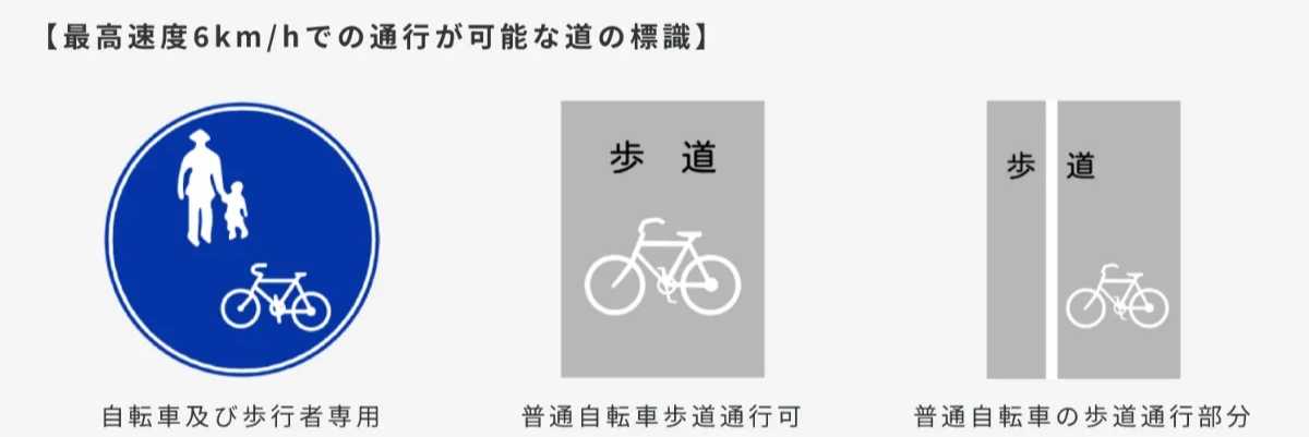 なお、歩道を走行する際は最高速度6キロ以下で下の標識や表示があるところと