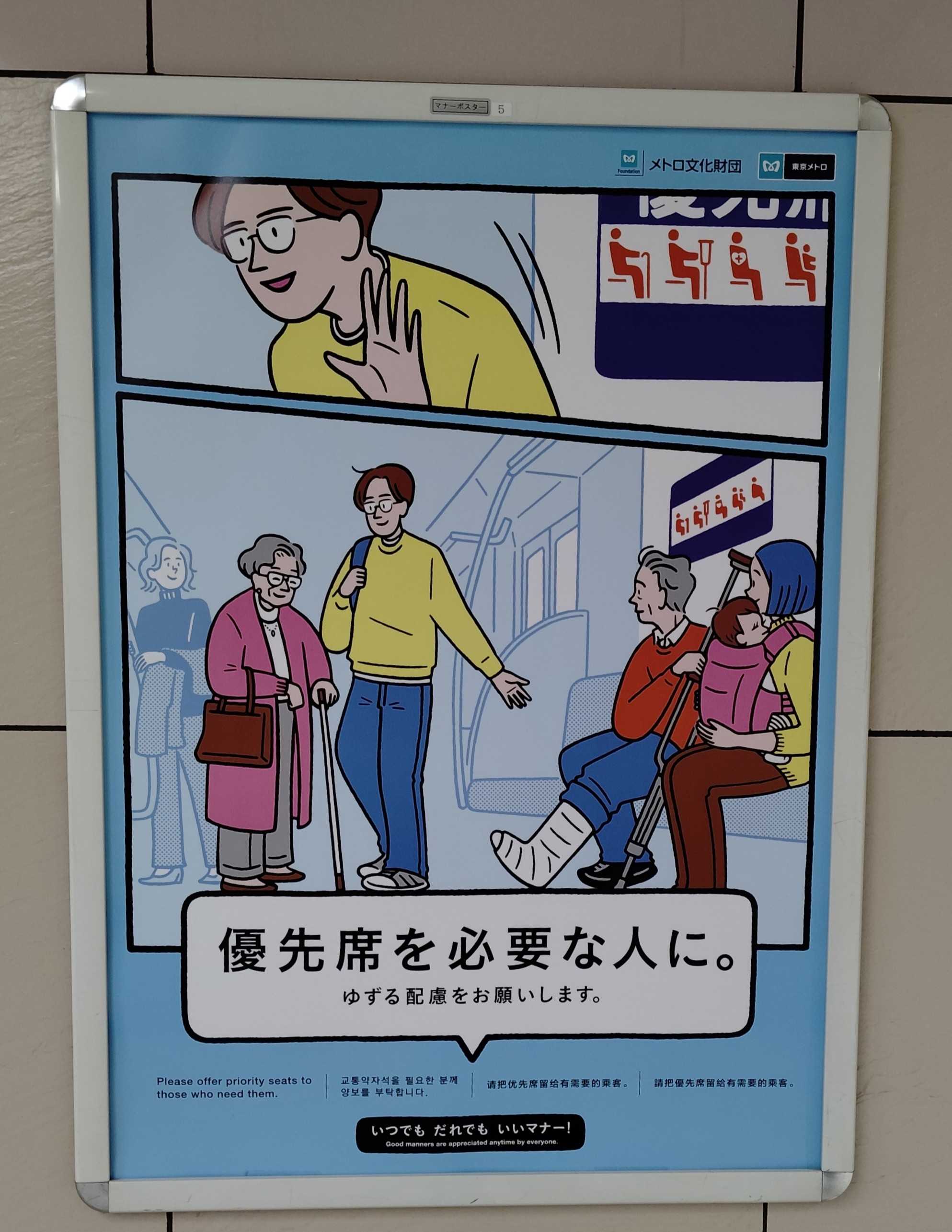東京メトロでは毎月、月替わりでマナーポスターを全駅全路線(180駅9路線)に掲示しています。電車内は中吊り方式。今月のマナーポスターです。