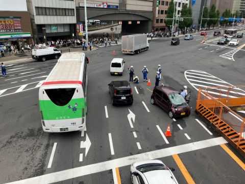 昨日午前11時10分ごろ東京・JR上野駅不忍口(しのばずぐち)前の交差点でタクシーが歩道に入って信号待ちをしていた通行人にぶつかりました。 9歳の女の子・40代の母親、60代の男女合わせて4人が怪我をして病院に搬送。打撲や骨折をし、60代の女性は両足を骨折する重傷。全員、命の別条はありませんでした。警視庁上野署によると事故を起こしたのは70代の男性ドライバーで「並走していた車が近づいて幅寄せをしてくる気がしたので左に避けようとしたら歩行者にあたってしまった」と供述。タクシーには乗客は乗っていませんでした。上野署は男性ドライバーを過失運転致傷で調べています。*現場から数メートル離れた上野駅広小路口近くで事故を起こしたタクシーを検分、個人タクシーでなくタクシー会社所属の車のようです*自分は半世紀以上前から上野に行くと9割ぐらいは利用する場所でゆるいカーブになっています。左にもう1車線あったのですが数年前から工事で塞いだ形にしてしまい、そこに信号待ちの歩行者が立っている事が多いです。*自分もそこで信号待ちする事あります*戦前からあるガード下の交差点なので、橋脚にぶつかっていたら上を走っている山手線(やまのてせん)や京浜東北線などに影響が及んでいた可能性が。反対側の車線で起きていたらアメ横の出入り口や家電量販店のヨドバシカメラがあるので、被害がもっと大きくなっていたかもしれません。画像はネットから借用しました。最後の画像は8月に自分がたまたま撮った画像です。