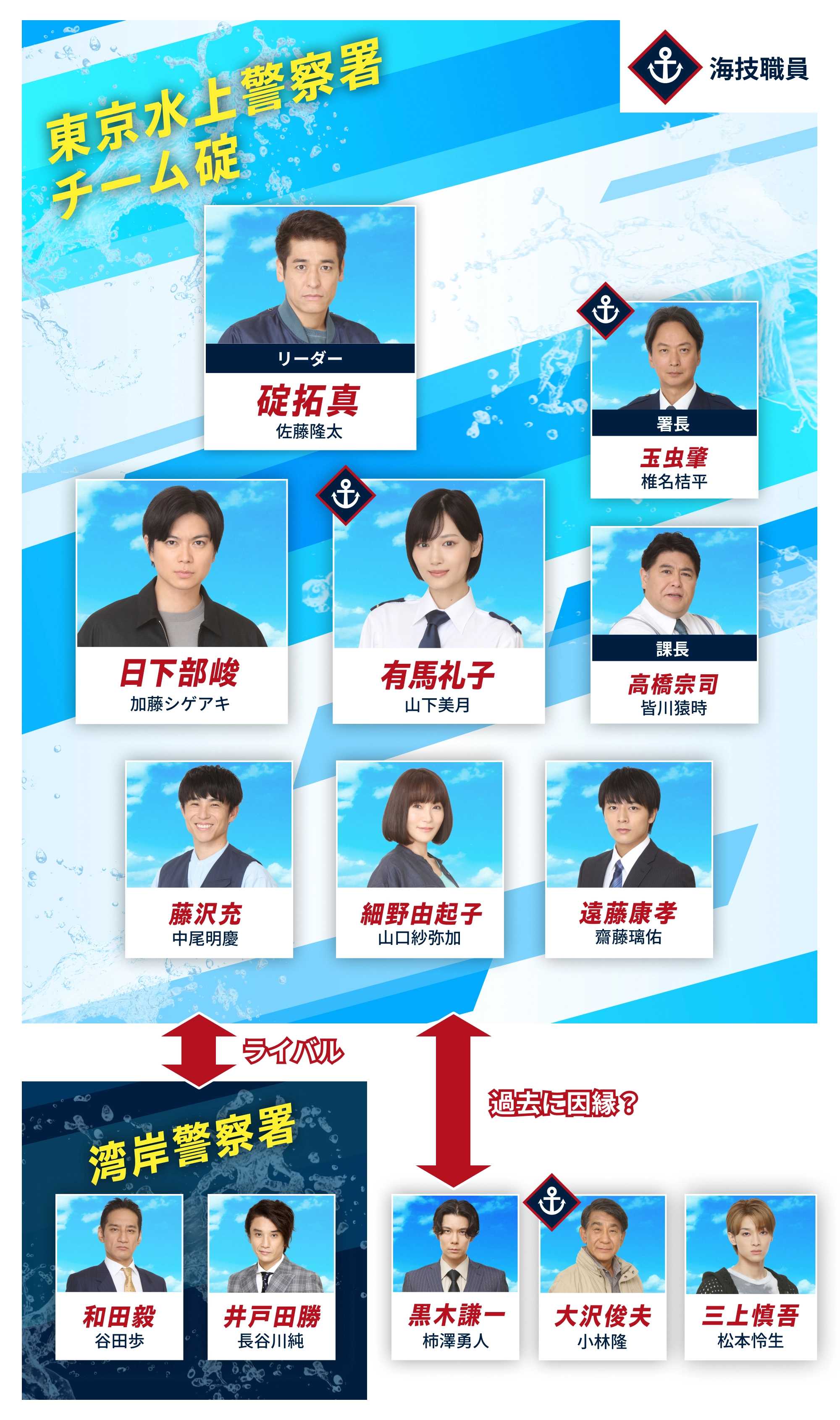 新東京水上警察は7日から放送開始したドラマです。原作は吉川英梨(よしかわ えり)先生の同名シリーズの小説です。主演は佐藤隆太さん出演者錠 拓真(おきて たくま)水上署強行班係係長20年以上の刑事歴、向こう見ずだが観察力は鋭い。佐藤隆太さん日下部 峻(くさかべ しゅん)水上署設立にあたり警視庁捜査一課から異動。湾岸署→警視庁捜査一課→水上署と異動しているが、上昇志向が強く早く警視庁捜査一課に戻りたいと願っている。加藤シゲアキさん有馬礼子警備艇を操舵する海技職員のため、逮捕権限はない。水上署設立にあたり湾岸署から異動。日下部の恋人。異動辞令でお互いに驚き恋人関係を隠していたが、錠によってチーム内にバレる。山下美月さん*ドラマのオファーを受けてスケジュールをぬって1級船舶免許を取得、ドラマの中で操舵を自ら行っています*藤沢 充元鑑識水上署には鑑識係がいなく貴重な戦力。チームの中で唯一の妻帯者。中尾明慶さん細野 由紀子水上署設立にあたり湾岸署から異動。上司にも後輩にも遠慮なく突っ込んでいく、少年事件に長く関わっていたので若者の心を掴むのが上手い。山口紗弥加さん遠藤 康孝交番勤務から異動してきたので、チーム最年少。錠と同じ大学で錠に憧れている。齋藤璃佑(さいとう りゅう)さん高橋 宗司水上署強行班係課長皆川猿時さん和田 毅湾岸署刑事湾岸署の一部署から独立して水上署として復活したので、水上署の事を良く思っていない。日下部の湾岸署時代の先輩刑事。谷田 歩さん井戸田 勝湾岸署刑事和田の部下。長谷川 潤さん大沢 俊夫海技職員OBでかつてあった東京水上署で玉虫の先輩だった。有馬の憧れている人物。小林隆さん玉虫 肇東京水上署署長2008年に湾岸署設立にあたり東京水上署は閉署。旧東京水上署で海技職員に就いていた。湾岸署転属にあたり、警察官に鞍替えし新東京水上署署長まで上り詰めた。そのため、人一倍水上警備に思いがあり湾岸署や警視庁本部と揉めたくなく強行班係の捜査にストップをかける事もある。椎名桔平さん上記画像は原作の1作目。火曜日夜9時(フジテレビ系)時間帯に見るのが厳しい方は見逃し配信のTVer(ティーバー)で視聴できます。画像はネットから借用しました。