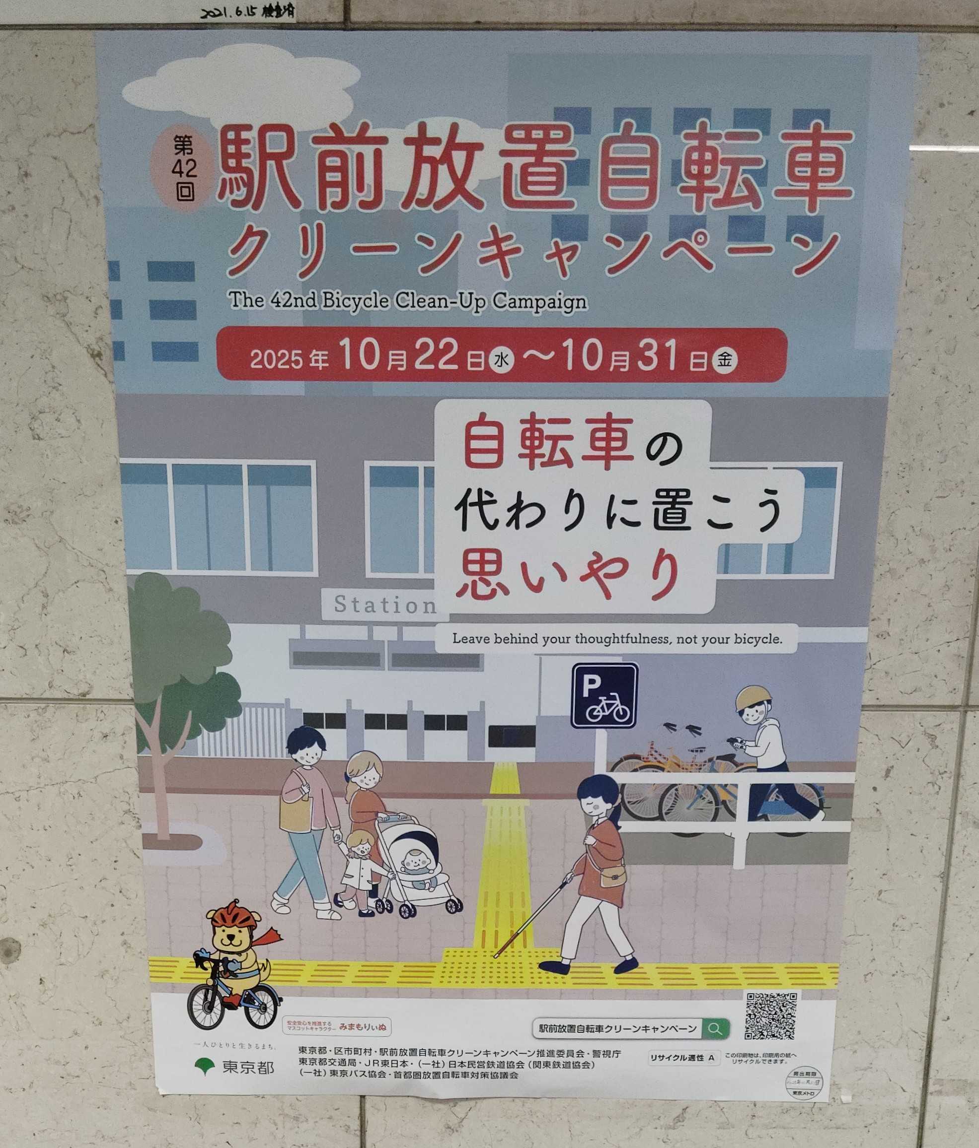 駅前放置自転車キャンペーンとは歩行者や車椅子の方、視覚障害者の通行の妨げ災害時や救助活動の妨げ街の美観の悪化自転車の盗難や自転車にいたずらなどを抑止する啓蒙活動です。東京都では年1ですが長年行っていてとなっています。愛知県と大阪府も11月に同様のキャンペーンを毎年行っているそうです。他の自治体では名称が異なっていたり、実施期間が違うところも。下の画像は協力している警視庁のでリーフレットとして配布を。最後の画像のみネットから借用しました。