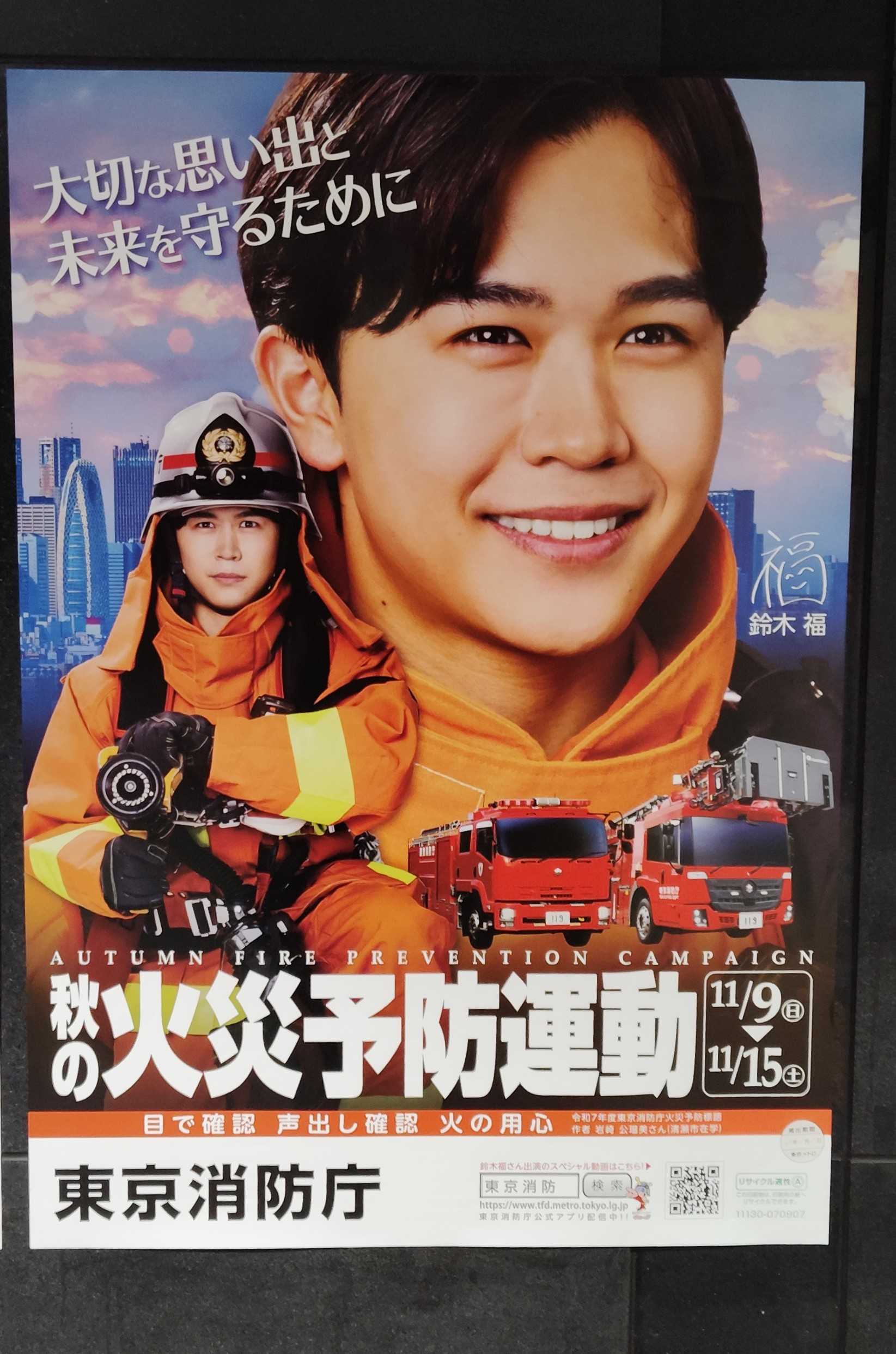 今日から秋の火災予防運動が始まりました。画像は東京消防庁のポスターで、俳優の鈴木福さんを起用しています。