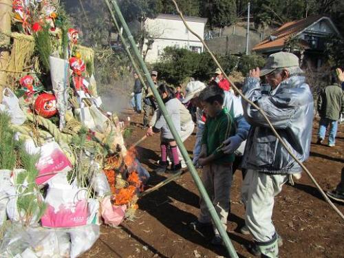 今晩は。今日は地元のどんど焼きでした。午前と午後に町内会の下の単位の各谷戸の氏神様の近くの広場で、例年通り行われました。強風や雨のときに翌日に延期で切るようにと、毎年1月の連休の初日に行われます。この写真は、本日午後、山王社と言う小さな神社の下に開けた、お近くの方の畑を借りて行われたどんど焼きの模様です。地主さんは、冬野菜を作らず、作るのは春から秋までとして、どんど焼きのために、冬場は畑を休ませてくださっているのです。なかなか出来ることではないですね。皆さんとっても感謝していらっしゃいます。午前中に世話人さんたちが要した祠に、まず地元の小学校の3年生が点火します。あっという間に燃え上がって、10分足らずで3枚目の写真のようになります。30分後には熾きの出来上がり、女性陣が用意してくれた300個のダンゴが、棹に刺して配られます。煙たいなぁと顔を背けて棹を出す子を、次第にみんな真似をします。2時過ぎには影も長く伸びて…最後は、皆さんの帰られた後、後始末をして土を均し、春野菜の作付けに支障のないようにするために、残っていらっしゃる世話人さんたちです。今年もにぎやかに実施が出来ました。