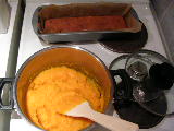 先日買ったかぼちゃ、ホッカイドウ。ようやく日の目を見ることができました。ぐーたらな所有者でごめんよ、かぼちゃん。本当は、かぼちゃあんこを作ってパイシートで、って思ってたんだけど、色々かぼちゃで検索してたら、かぼちゃのパウンドケーキなんて素敵なレシピを見つけて、しかも簡単だったので採用させてもらいました。かぼちゃのお菓子だいすき。かぼちゃの煮付けとかはあんまり興味ないんだけど、栗と一緒で、ペーストになってたり、ケーキ、クッキーとかになってるかぼちゃには目がありません。自分で作れるのねー・・とちょっと感動。まず、かぼちゃをなんとかします、ね。はい。ゆでて裏ごすんだって。裏ごし機がないので、調べた結果、ピューレマシンでもいいらしいので、レンジでチンしたかぼちゃをゴゴゴゴッとピューレしました。しかし、かぼちゃってのは硬いんだね。あまりの硬さに一回目、包丁刺したままちょっと考えちゃったよ。半分に割るのにえらい時間かかっちゃった。かぼちゃ刺ししてる間、ふと、私の人生の中でかぼちゃを切るのは初めてだわ・・とか感慨に浸りつつ。何しろお勝手が狭いので、派手にやると色んな物にあたって落ちる、飛ぶ、跳ねるって感じなので慎重に、ゆっくりやらないといけないんです、うち。そして粉、バター、砂糖、卵黄、卵白などど一緒に(要はパウンドケーキです)かぼちゃんを混ぜて、種も混ぜて170度で焼きました。残ったかぼちゃんは、砂糖を加えてあんこにしました。手前があんこ。しかし、一回目は小さい型用の量だったらしく、パウンドケーキっていうか、スティックケーキみたいになってしまいました。が、カフェオレと一緒に秋のおやつ。あ、初冬か?だらだらしてたので旬の時期を逃しました。ちなみに昨日も2回目に挑戦して、量を単純に2倍にして焼いたらまさにパウンドケーキのように出来上がって、とっても満足でした。バターがたくさん入ってるので、一切れ食べたらもう満腹でご飯代わりになってます。不健康ですねー。来週末は、フルダに行くんですが、さっき電話でウズラ(義母)が、ぜひそのケーキを作ってくれ!と言うので出前出張する予定です。最近はねー、ほんとにラザニアなんかも作るようになっちゃってあたし。いやいやいやいや、しゅふですよ。米も炊くしねー。でも、レシピがないとまだやっぱり駄目みたいですが。頭でちゃっちゃっとメニュー考えられるようになってから偉そうなことは言うようにしようと思います。次、挑戦するレシピは、クリームドリアです。私だけエビ入り。楽しみだー。
