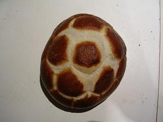 金曜日は週末前ってことでいつも人で賑わって騒がしいフラブルですが、こないだの金曜日は何故かとっても静か・・・・。怖いくらい。週一の買い出しに出向いた大型スーパーにもまばらな人・・。いつもならごちゃごちゃしているのに・・。ふと、これってもしかして今日(金曜日)ワールドカップ初日だから?と思いつきました。んでスーパーのレジの人達も暇があったら固まって何かをささやきあっているし。2点目が・・・・前半が・・・そよそよそよそよ・・・。あ、ちがった、ひそひそだった。兎に角、旦那さんがレジの人に、もしかして今ドイツ戦やってるの?と聞くと、もちろーん!!!と、あんたがた何言ってるの!と怒られそうな雰囲気で言われました。なるほどそれで人が路上にいないわけだ・・・っていうか、まじで?さすがすごいサッカーの威力・・・。みんな家かビアガーデンかパブでテレビ漬けらしい。買い物を終えて家に帰って、じゃ、とばかりにうちらも見始めました。後半ロン毛の人が鮮やかなシュート!ゴール!の時は展開の速さに思わず、おっ!!と叫んでしまいましたが、私の声と同時に数軒から、おっ!!!という声が聞こえてきましたよ・・。ああ、今この瞬間に一体何百人、何千人、何万人の人が、おっ!!と言ったんだろう・・・、となんだかこう、スポーツの醍醐味っていうかですね、おらーワールドカップだぜーって見てるわけじゃないんだけど、単純に、世界の人と同じ気持ちをシェアしてる、とちょっといい気分になりました。試合が終わると徐々に騒がしくなり始めた町。既にドイツの大旗持ってクラクションを派手に鳴らしながら車が族のごとく走っている!初戦じゃーーん。熱い、熱いですドイツ。そんなドイツに負けないぜとばかりに、明日はいよいよ日本戦ですねー。バイトとドイツ語コースの間の時間、という落ち着かない時間帯ですが、青いTシャツ着て応援したいと思いますよ!(まじで?)これ食べながら。このベタな感じがたまりません、サッカーボールブレッツェル!まんまとのせられて買ってしまいました。
