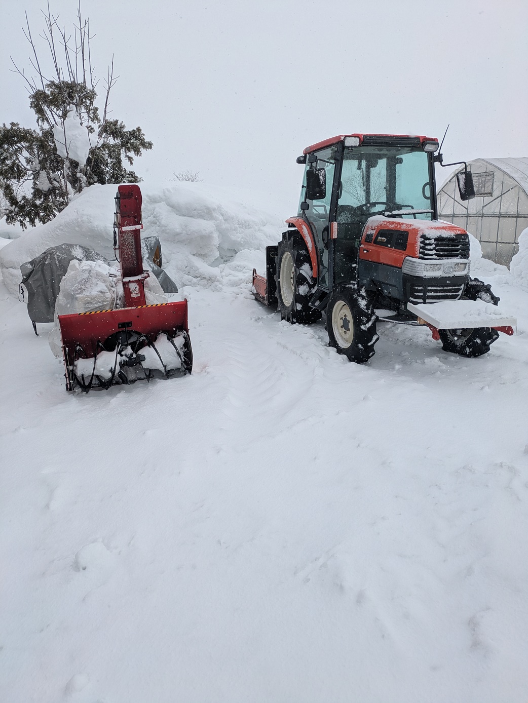 雪でつぶれたパイプを外しながらシートを切り開きながら。屋根の雪を除きながらとりあえずコンバインを救出しました。若干傷んだ部分もありましたが基本の動作には問題なさそうです。次は奥の田植え機の救出作業が待っています。こちらも大きなダメージはなさそうです。ほっ。 です。