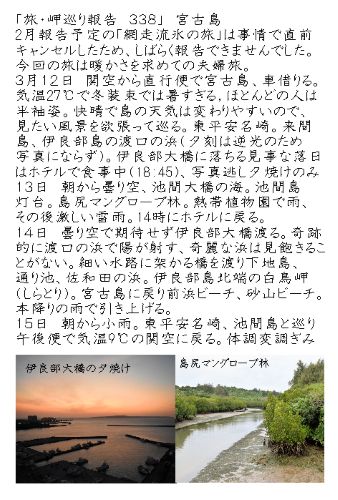 友人、岬麻呂氏からの旅便りです。(旅・岬巡り報告338・宮古島) 岬麻呂氏からは「次は流氷の旅」だとの予告を受けていたので、そのつもりでいましたが、これは直前でキャンセルされたようで、今回は宮古島へのご夫婦旅であります。 以下は、旅報告の添付写真です。(添付写真1) (同2)(同3) (同4)(同5)(参考地図・宮古島)※参考地図は地理感のない読者の便宜のため、ヤカモチにて適宜に挿入させていただきました。ご参考になれば幸いです。 では、例によって別途メールで送信いただいた写真をその旅程に従い、ご紹介しつつ、旅をご一緒させていただくこととしましょう。 しかし、今回の写真は、カメラの撮影日時記録表示機能に故障が生じたようで、正しい撮影日時が記録されているという保証がないので、これを手掛かりに旅程を探るというヤカモチの手段は封殺されている次第。 よって、岬麻呂氏がその撮影日別に付してくださった番号順に、写真をご紹介することといたします。3月12日関西空港→宮古空港→(レンタカー)→東平安名崎→来間島→伊良部島・渡口の浜 関空から直行便で宮古島へ。 気温27℃とあって、殆どの人が半袖姿。 快晴であるが、島の天気は変わりやすい。見たい風景は欲張ってでも手早く回るにしかずと、レンタカーで先ず向かわれたのは東平安名崎。(東平安名崎)(同上)(参考地図・宮古島 東平安名崎) 東平安名崎から西方向にとって返して来間島へ。(来間の海) 対岸は、前浜ビーチ。 右端に写っているのが来間大橋。(同上)(同上)(参考地図・来間島、来間大橋) 来間島から宮古島に戻り、北上。(渡口の海) 伊良部大橋を渡って、伊良部島の渡口の浜へ。(参考地図・伊良部大橋、渡口の浜)(伊良部大橋の夕焼け) 落陽は慈愛の色の金の色・・と来れば中原中也であるが、金色に沈む夕日は、丁度ホテルでの夕食の時刻に当たっていて「お見逃し」とのことにて、夕焼けのみの写真となりましたが、残照もまた味わい深き眺めというものであります。(平良港の夜景)沖辺おきへゆく 船の灯あかりを 見つつもや 語らな我妹わぎもと 来こし方などを (偐岬持) 岬麻呂氏のメールによるご説明では、「時間は20:14ですが、灯火が多く画面が明るいです。中央奥の海に船舶の明るい灯が写っている右横の高い位置の灯りは『池間島灯台』です。」とのこと。3月13日池間大橋→池間島灯台→島尻マングローブ林→熱帯植物園 旅の二日目は朝から曇り空。 宮古島を北上、池間島を目指します。(池間の海) 池間大橋を渡って、池間島へ。(同上)(参考地図・池間島、池間大橋) 池間島、右回りか左回りかは知らねど、島を一周、島北部の池間島灯台に立ち寄り、池間大橋から宮古島に戻り、島尻マングローブ林へ。(島尻マングローブ林) マングローブ林で見かけた蟹、シオマネキと暫し戯れ・・。(シオマネキ) 宮古島のほぼ中央部にある、熱帯植物園へ。 この辺りで雨になり、やがて激しい雷雨に。(熱帯植物園) そんなことで、ドライブも切り上げることとし、午後2時にはホテルに帰還でありました。3月14日伊良部大橋→渡口の浜→下地島→通り池→佐和田の浜→白鳥岬→宮古島→前浜ビーチ→砂山ビーチ 旅の三日目は、もう一度、伊良部島へ。(渡口の浜) 渡口の浜から下地島の佐和田の浜へ。(参考地図・伊良部島、下地島)(佐和田の浜)(白鳥岬) 宮古島に戻り、前浜ビーチ、砂山ビーチへ。(前浜ビーチ) 上の写真に写っている橋は、伊良部大橋だろうから、伊良部島に向き合った浜が前浜ビーチということになる。(追記訂正:2025.3.25.) 写真の橋は伊良部大橋ではなく、来間大橋とのこと。 対岸の島影は来間島で、伊良部島ではありません。 従って、対岸の島を伊良部島であることを前提とした記述は全て誤り。 前浜ビーチ=与那覇前浜ビーチ、であります。 前出の「来間の海」の写真で、来間島に向き合った浜も前浜ビーチとの説明であったので、ヤカモチの頭はいささか混乱気味。 「前浜」というのは、対岸に島を望む地形にある浜を意味する普通名詞と考えれば、あちこちに「前浜」があっていい訳である。 しかし、「前浜ビーチ」となると固有名詞なので、本来は「〇〇前浜ビーチ」などと区別できる呼称であることが望ましいということになるが、地図によると、来間島対岸の前浜は、与那覇前浜であるようです。(砂山ビーチ)3月15日東平安名崎→池間島→宮古空港→関西空港 最終日は朝から小雨と生憎のお天気。 再び、東平安名崎を訪ね、灯台や巨石群を撮影。(東平安名崎灯台)(東平安名崎の巨石群) 島の南東端にある東平安名崎から島の北端の先にある池間島にも再訪し、午後便で関西空港へ。沖縄と大阪との気温差で体調を崩されたようですが、大事に至らず快癒されたようで何よりです。<参考> 過去の岬麻呂旅便り記事はコチラ。 フォト蔵アルバム・岬麻呂写真集はコチラ。