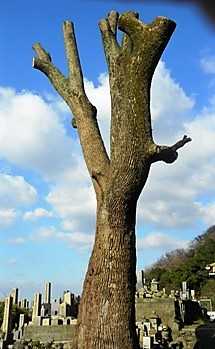 墓地のシンボルツリーとも言える楠の大木が、「煤払」ならず、枝打ち払われて何とも情けなき姿になって居りました。今月初めに来た時は未だ堂々たる姿であったのに・・小生が散髪に行って伸び過ぎた髪を切ったのに合わせて楠さんもサッパリしたお姿に・・であります(笑)。