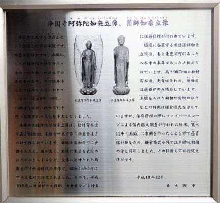​浄国寺は、開基不詳であるが、枚岡神社の神宮寺であった来迎寺(浄土宗)の隠居寺として復興し、延宝9年(1681年)に融通念仏宗に改宗したとのこと。本尊は、木造阿弥陀如来立像(東大阪市指定文化財)。​