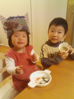 仕事は適度に切り上げる。今夜は節分・まめまきだ。夕食の前にイベント実施。やまやろうが鬼となり、こどもらにぐわぁと襲いかかる。そこに嫁さんの豆攻撃。すかさずむすこも豆をまく。むすめは床にぱらぱら(狙っていない)。あいや鬼さん退散。夕食は嫁さんのお手製太巻きだ。サラダ巻きってやつだ。それとおいなりさん。ひたすら食べまくった。うめなこら。つまみには豆だ。こういうささやかなイベントが、今のやまやろうには幸せに感じることである。