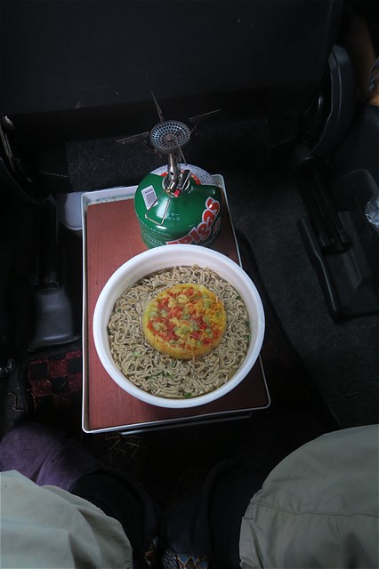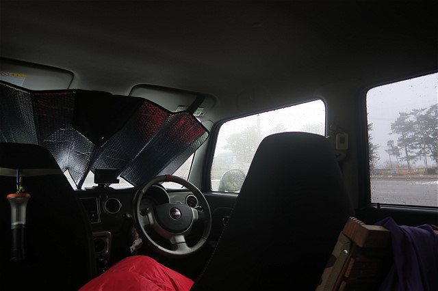 寝る際は、背もたれを使わず座面に横になった。運転席の足元に足が飛び出したが、横臥で何とか寝られた。よく眠れた方だ。