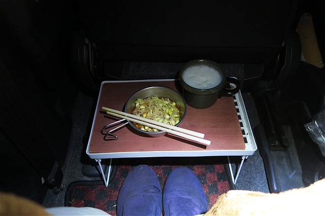 キムチもやしをむしゃむしゃ食べる。ヘルシーなおつまみだ。車内は静かで暖かい。テントより快適だ。音楽で気分を盛り上げる。