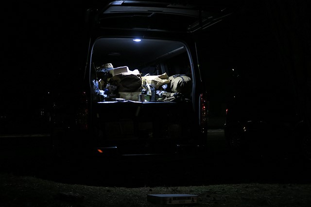 19:52 ラパンの後部座席に移る(テントなしの車中泊)。車中泊は何度も経験しているので、落ち着く空間だ。