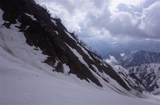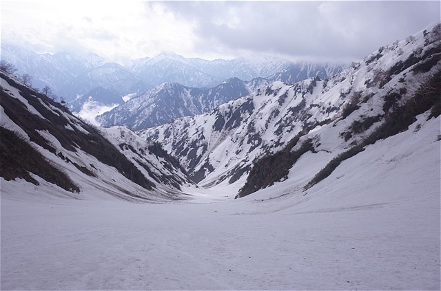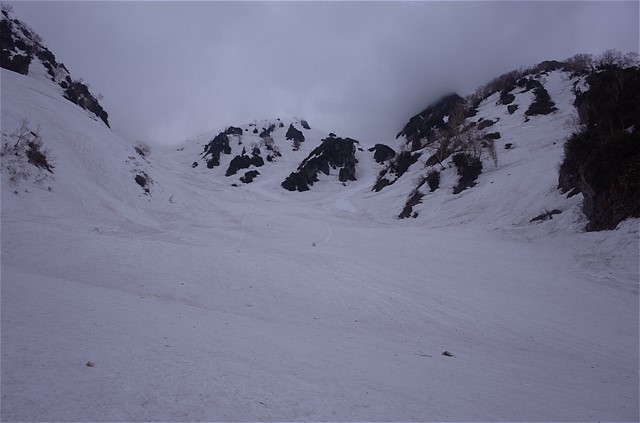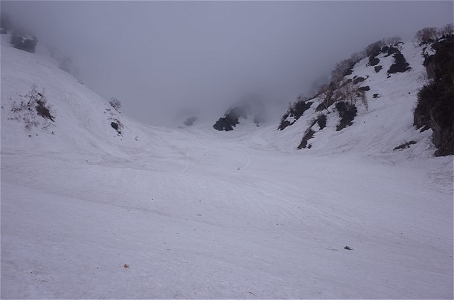 出合いの下部も中谷が左にカーブする手前くらいまでは素晴らしい雪斜面が続いている。