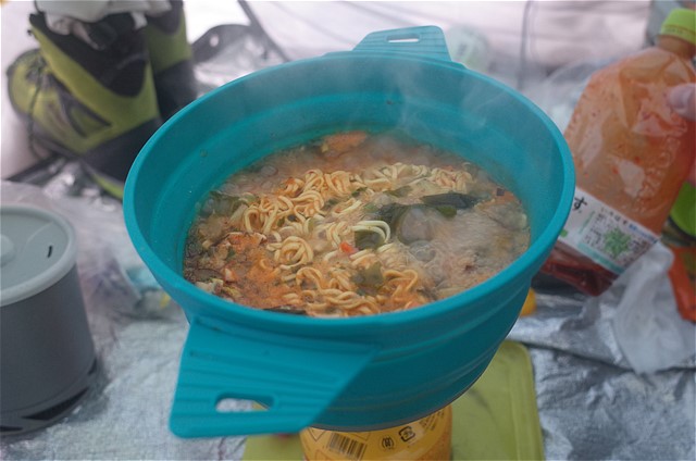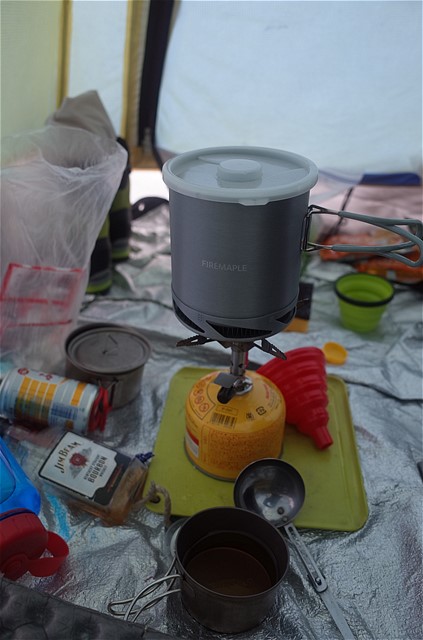 15:53 4Lの水作りが終了する。ファイヤーメープルのヒートエクスチェンジャー付きアルミクッカーの熱効率が良好で、水作りの作業が大幅にはかどったのだ。OD缶1個で三日間が過ごせそうだ。今後のG会のテント泊で使ってみるか。