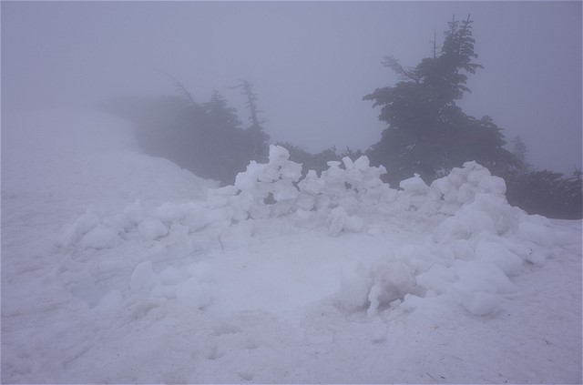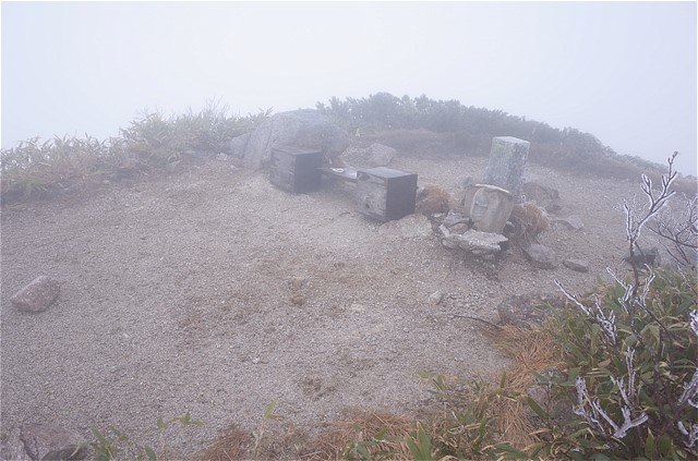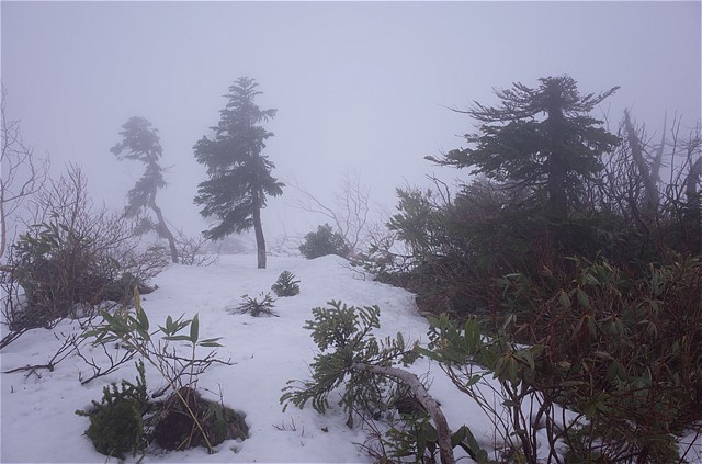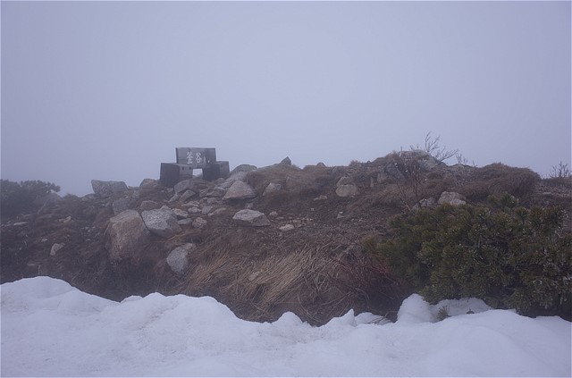 11:03 毛勝山頂。周囲は何も見えない。かろうじて三角点付近は見えた。雪が降る寒さ。GWでまさか真冬の天候に遭遇するとは思っていなかった。