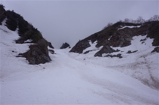 7:26 1773m 釜谷山の北方2286コルからの谷と合流する。この谷はスキーゲレンデである。