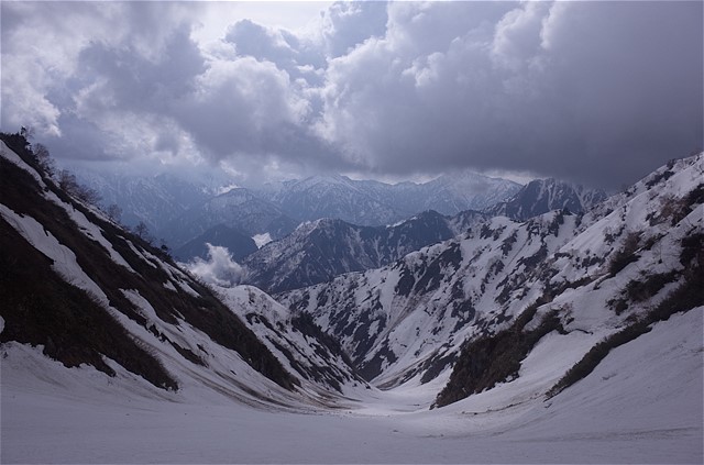 中谷右俣の標高1750m付近から、下流を見た景色。スキーに好適な斜面がずっと続いている。
