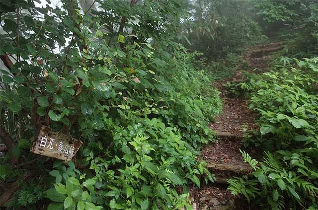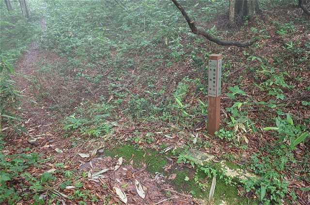 ビジターセンター西の尾根道に入る。いきなりの急登で汗が噴き出る。次第に雨は本格的になるが、登山道の上に広がる木の葉で雨はしのげる。