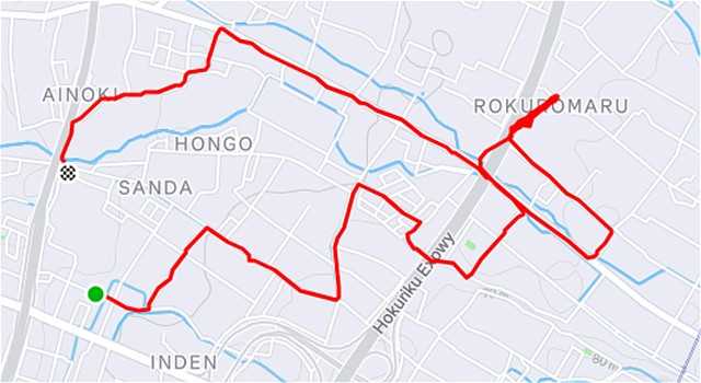 今日は短めにした。右上に飛び出ているトラックが、北陸自動車道の日陰で走った地点。6往復した。日陰でもきつかった。