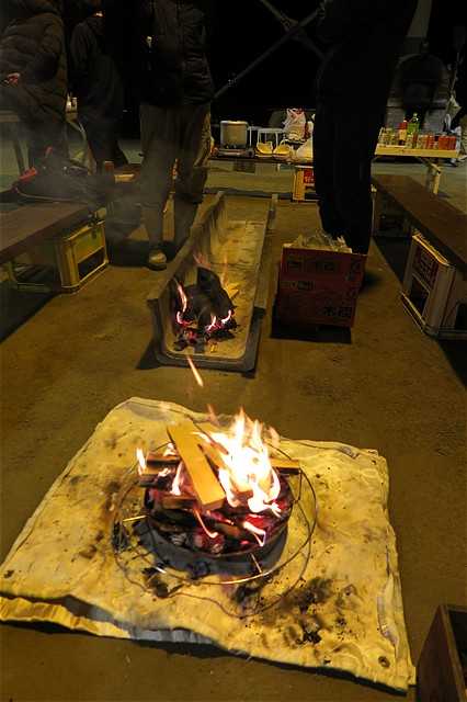 会場は寒いと思ったので、焚火をやります。焚火台でごんごん薪を燃やしてから、U字溝に薪を分けて炭を熾すことにした。しかし案外寒くないー。
