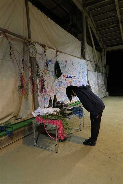 クライミングロープとカラビナを上手に使って、壁面の飾り付けを行った。祭壇のテーブルは全てやまやろうの持ち出し。サカキを置く台とか日本酒を置く台とかも全て自宅から持ってきて組み上げた。使うと思わなかったものが、有効であった。