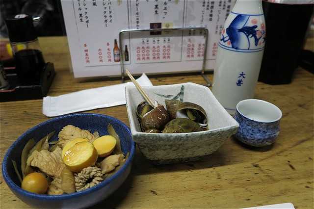 つまみは、カウンターに並んでいるものを好きに持ってくるスタイル。まずは、バイ貝煮付けと鶏ごぼう(キンカン、肝入り)とした。