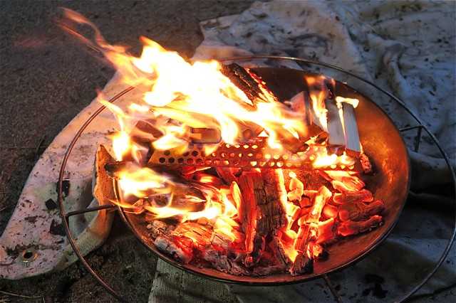 いい感じです。寒かったのでガンガン薪をくべる。メタル薪に立てかけるように置くと、風上側の薪から順に勢いよく炎が上がる。