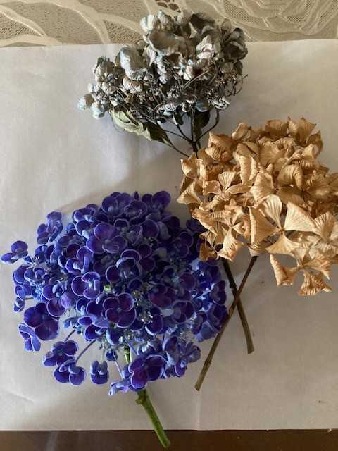 左から、今年の紫陽花、昨年トイレに吊るしてドライフラワーになった紫陽花
