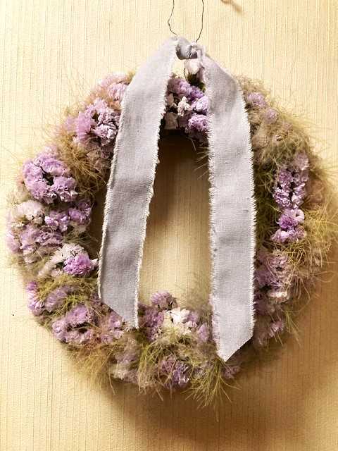 これはフラワーアレンジメントをしている友達作成のスモークツリーとスターチスのリースです