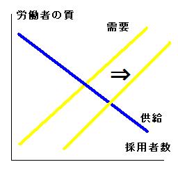 ここ数年新卒採用数が拡大している。景気回復の象徴として歓迎される傾向にあるが、実際はどうだろうか。 新卒採用の問題を単純化するため、縦軸に労働者の質、横軸に採用者の数をとったグラフを考えてみる。新卒採用数を増加すると言うことは、需要曲線が右方シフトするということだ。その結果、数は増えるものの採用する労働者の質が落ちることになった。(もっとも最近の学生の潜在能力が今までの学生(特に就職氷河期卒業世代)よりも圧倒的に高ければ、質は落ちないだろうが、そんな話は聞いたことが無い。) 採用する労働者の質を落とさずに数を増やそうとするのであれば、企業はどうすればいいだろうか。一つの方法としては、採用の源泉を増やすこと、端的には採用を新卒に限らないで、非正規社員の正社員化とトータルで採用者数を確保することだ。こうした採用方針を採ることで供給曲線が右方シフトする。直感的に考えて新卒採用数の増加と、採用する労働者源泉を新卒に限定せず中途採用に拡張することを比較すると供給曲線の右方シフトによる効果の方が大きい。 結果的に均衡点はE2からE3に移動し、数のみならず質の向上も達成した。それでは何故、企業は新卒採用を拡大しようとするのか。 この疑問を解決する上で考えなければいけないのが日本型雇用システム、つまり年功給と終身雇用だ。近年終身雇用システムは崩れつつあるが、年功給は依然として有効だ。コンサルタントの城氏は年功給システムをねずみ講などと称していたが、まさに既得権益の塊を作り出したこのシステムを維持する上で重要なのが新卒一括採用なのだ。だから企業は非合理極まりない新卒一括採用を依然として採用し、卒業時期による格差を初めとして色んな格差を生み出しているのだ。 この問題を解決するには給与システムの変革など抜本的な改革を断行する必要があるが、それには既得権益との対決が待っていてすんなりとはいかないだろう。 詳しく知りたい方はあたりを読んでみて(読み返してみて)はいかがだろうか?
