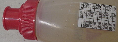 無駄に長いです・・・◆レース概要 かなりおおざっぱにいうと、3つのピークを登って、下って戻ってくるというレースです。最初のピーク(大室山の途中)は標高1400mぐらいで、登り口からの標高差は1000m。二番目のピーク(日蔭沢原頭)は、標高1000mで、登り口からの標高差は400mちょっと。三番目のピーク(姫次)は標高1433mで、登り口からの標高差800mちょっと。つまり、累計2200m強を登って、下って、距離にして43.86kmを移動して、12時間以内にスタート地点まで戻ってくるというレースです。 改めて、数字にしてみると凄いですね・・・◆レースプラン 試走の結果と、色々な方のブログを参考にして、各ポイントまでの想定タイムを決めてみました。目標タイムは、8時間を切ることです。設定タイムは、ジェル用ボトルに貼ってみました。◆スタート~神ノ川キャンプ場 想定タイム1h20m スタートから山道に入る所で渋滞するという情報は、色々な方のブログとH師匠からのアドバイスにより知っていたので、umeumeさんとスタートで前の方に陣取りました。スタート地点で周りを見渡すと、バックパックからチューブがでている人ばかり。何かとっても異様な雰囲気です。でもよくよく見ると、装備は割りとまちまちで、ウエストポーチに小さいボトルのみなんて方もいて、驚かされます。天候は曇りですが、大会関係者の方によると、徐々に晴れるということで、暑さとの戦いになることが予想されます。 いざスタート。スタートゲートが狭く、いきなり分詰まります。スタートから山道まで1kmちょっとは、アスファルトの道です。何とか無事ゲートを通ると、山道まで、強すぎず、弱すぎず、どっちかと言うとやや強めで、飛ばします。アスファルトながら、凄い坂道で、つっこみ過ぎると早くも死亡してしまいそうです。この力加減が非常に微妙で、難しい。10分程で山道の入り口に到着。さあ、渋滞だ、どんと来いと思っていたら、渋滞はほとんどせず。完全に脚が止まったのは、2~3回と言ったところでしょうか。結構スタートでがんばっため、渋滞は回避できたのですが、やや強めに行ったため、ちょっとぐらい渋滞を期待していたのに、あてがはずれました。それから20分の登りは存外きつく、息があがり気味です。前後の人たちは皆、粛々と登って行きます。隊列は乱れることなく、ただ粛々と。まるで、京へ向かう武田軍の行軍を思わせるような一糸乱れぬ隊列が、延々と続きます。 ようやく、右に折れて下りになります。下りになると、私の前の人が明らかに下りが遅いことが判明。下りのあるトレイルレースは初めてで、どういうタイミングで抜いたものやら、道も狭く抜くのに難儀しました。下りも10分程で、アスファルトの道にでて、ここからキャンプ場まではロードです。それまで前後を走っていたumeumeさんには、あっさり置いていかれます。私は、H師匠のアドバイス通り、1CPまでは余裕を持って進むべく、ジョグ程度のペースで行きました。沿道では、地元の皆さんから「行ってらっしゃーい」と声をかけていただきました。スタートから40分が経過し、何となく一仕事終えた気になっていましたが、そういわれるとまだまだレースはプロローグ、確かに「行ってらっしゃーい」だなと思いました。ロードは以外と長く、結構な人数にパスされて、ようやく神ノ川キャンプ場に到着。懸案の左膝は、山下りとロードで、早くも違和感あり。長い1日、果たしてもってくれるのでしょうか。 渋滞をうまく避けられたこともあり、キャンプ場到着は、予定より大分早い1h7m52sでした。◆神ノ川キャンプ場~神ノ川ヒュッテ(1CP) 想定タイム2h00m(合計3h20m) ここから先は、先週試走した区間なので、コースの状況がわかっています。キャンプ場の一本橋を渡ると、そこから山道が始まります。最初のピーク(大室山の途中)を目指して、ここから1000m登ります。 この辺りは、まだ皆元気で、無謀に割り込んで抜かしていく輩がいます。私は、H師匠のアドバイスどおり、1CPまでは余裕を持って進もうと決め、人の流れに身を任せます。20分程登ると、だんだん斜面が急になってきます。ランシューの人は、足元が滑ったりして大変で、渋滞とまではいかないものの、自分のペースよりはややゆっくり気味で進みます。途中、杖を持ち、丸腰の方がコースを外れて喘いでいました。戻った方が良いですよと声をかけてあげればよかったかな? ピークのちょうど半分となる鐘撞山の手前は、非常に斜度がきつく、早くも太ももの裏に緊張が走ります。明らかに遅い人もでてきて、致し方なく抜こうと無理をすると、ふくらはぎにも緊張が走ります。おお、やばい・・。とか何とかやっているうちに、鐘撞山の手前で、umeumeさんに追いついた。鐘撞山には41分で到着。先週の試走では44分かかっています、試走より遅いかと思っていたのですが、本番のが速かったようです。鐘撞山では、30秒ほど立ち止まりストレッチをして(S師匠のアドバイスより)