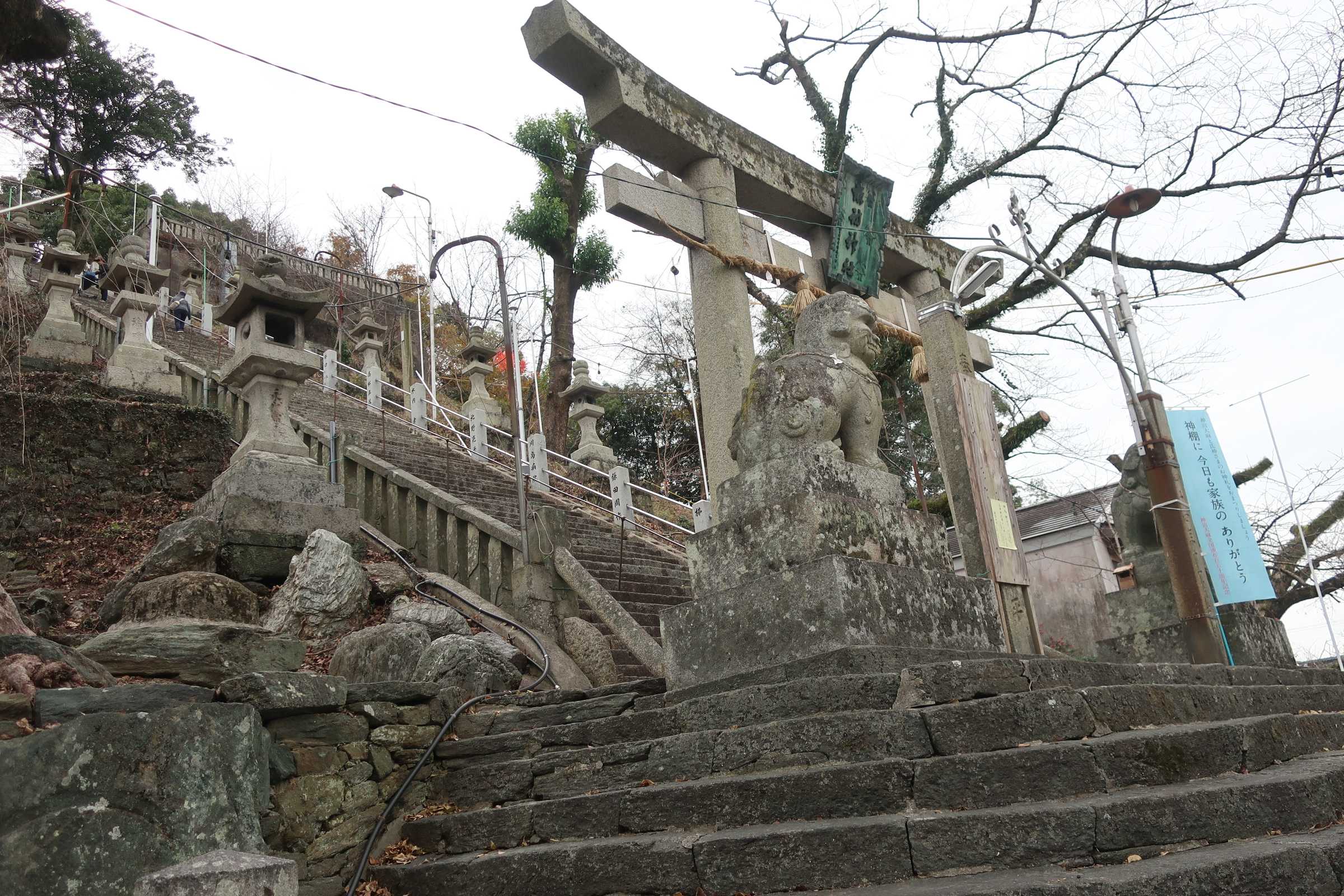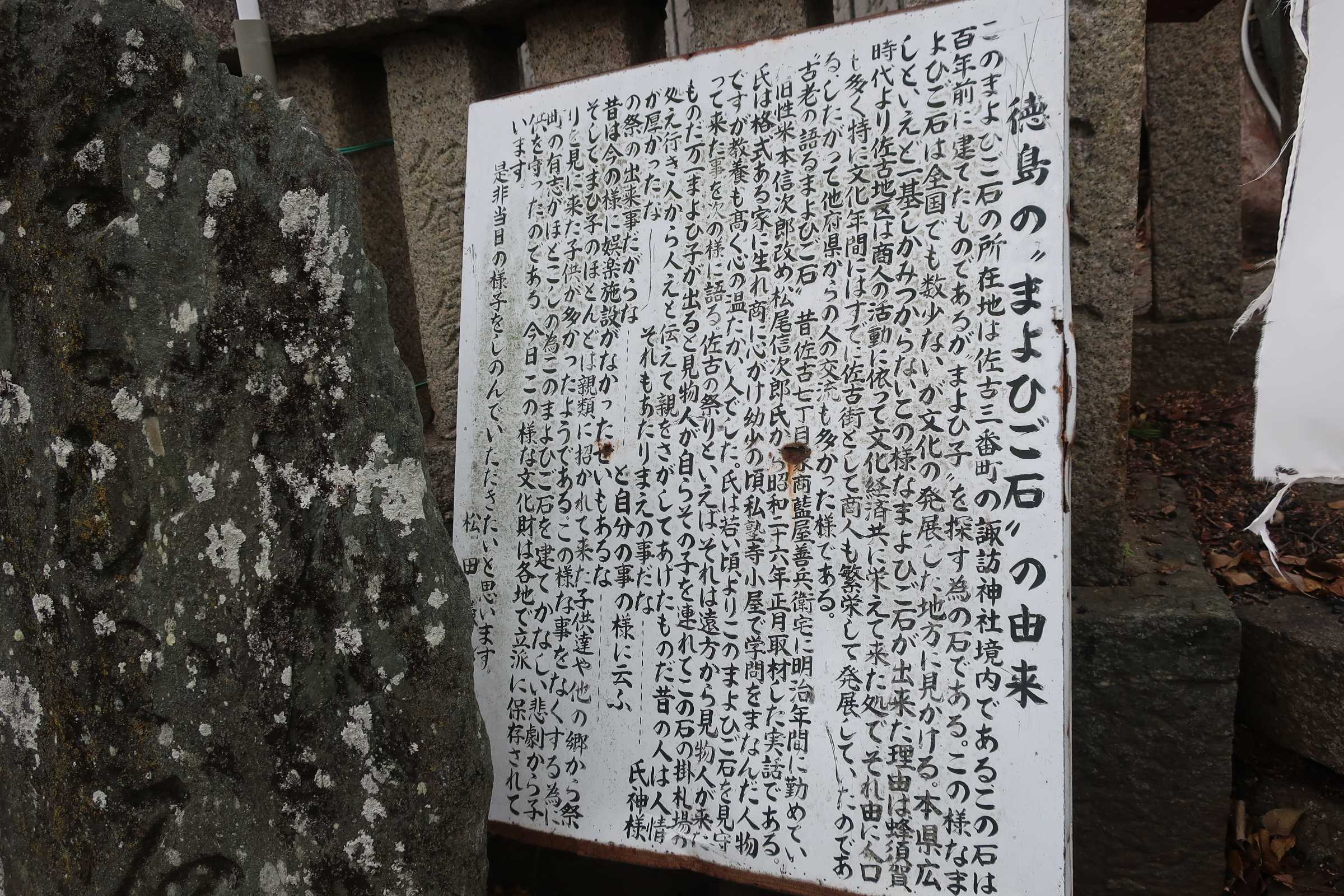 「まよひご石」眉山の北側の神社が集まっている所の諏訪神社に看板があります。
