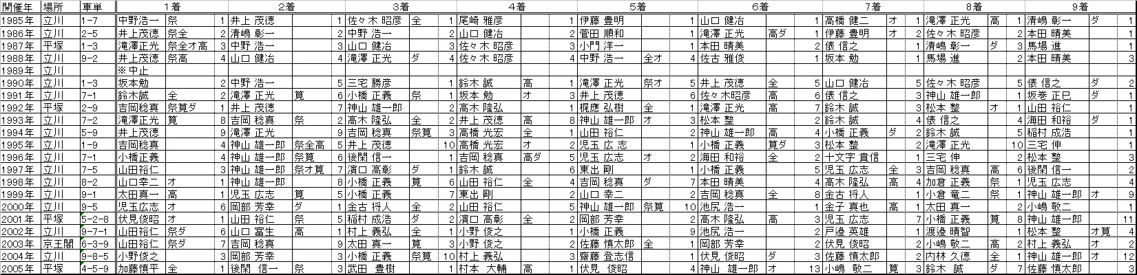 小田原記念も最終日、波乱のメンバーがそろい90点台の選手が二人も決勝進出今日の並びは峠祐介-神山雄一郎-兵藤一也村上義弘-加藤慎平-北幸博高木隆弘-佐藤康紀上吹越直樹峠を筆頭に2段体制の:関東強いレースを連日行ってきた村上率いる:近畿・中部村上ラインに割り込んでいくのか:地元単騎一発:上吹越決勝で2段に構えて成功したのは、あまり記憶に無い分断されたり、何もできずだったり。今回も村上が峠に叩かれたと見せかけてインから強引に発進関東3者が外を泳がされ、峠の脚が終わったときには、神山も発進できる余力が残っていないのでは?となると慎平が有利、上吹越の一発もありえるかな?高木はどうするのか上記の展開だと出る幕無しになっちゃう(本当かよ)そんなことは無いだろう、峠と村上が勝負どころでイエローライン上で位置の取り合いをするタイミングでインを強襲、どっちが先行しても番手に切り込み番手の選手は相当脚を使わされる展開かな、ならば脚ためる3番手+上吹越が浮上兵頭⇔村上、村上⇔北、村上⇔佐藤、村上⇔上吹越(ありえない組み合わせか)●結論兵頭⇔村上、慎平→村上