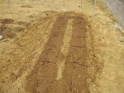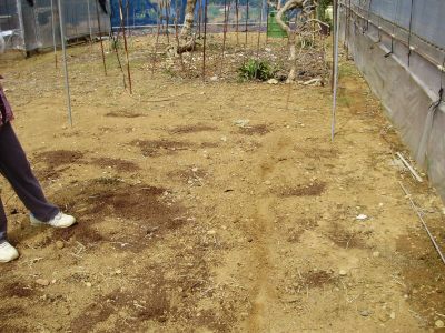 堆肥と石灰は蒔いてあるのであとはクワで耕すだけ 硬そうに見えますが、ユンボで深く開墾してあるので楽勝でした![]()