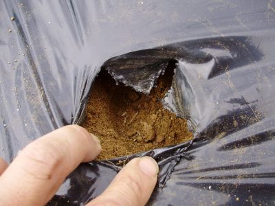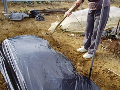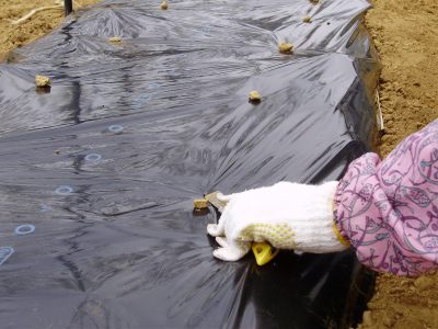こんな風に溝を作ると強風でマルチが飛ばされることがなくなります