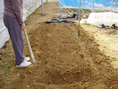 荒い土を畝の外に出しておくと植え付け作業がラクになります