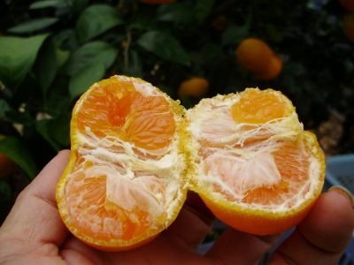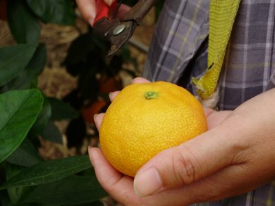 オレンジ色の濃いみかんを選んで収穫