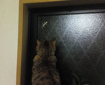 会社の同僚んちの子、きじ猫の「ハナちゃん」です。本名は「ハナミズキ」ちゃん。窓の外にイモリが居たらしく、思わず反射的に「ンニャッ!」っとやってしまった瞬間を撮られてしまいました。いつもは澄ま~してるクセに反射的に手が出ちゃうニャンコって可愛い~。(^^)同僚が家に帰ると、カツオブシがもらえるまで「スリスリ~スリスリ~」ってシッポの先まで甘えてくるそうです。ワンコは家に帰ると超~熱烈歓迎してくれますが、甘えて来るニャンコもいいなぁ~。
