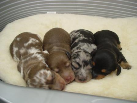 会社の同僚にダックスを飼ってる人が居て、初めての出産で四つ子ちゃんが無事に産まれました ^o^お父さんは『シルバーダップル』お母さんは『ブラックタン』なのですが、産まれた子供達は『シルバーダップル』『チョコダップル』『チョコタン』『ブラックタン』のなんと!それぞれ違う4色のわんこ達がっ! う~む見事ぢゃ!ちなみに、既に2匹の子わんこが里親さんへお嫁に行ってしまったそうで…。お別れの時、飼い主さんは淋しくて泣いちゃったそうです…。出産は大変喜ばしいけど、やっぱりお別れが辛いですねぇ~。(T^T)